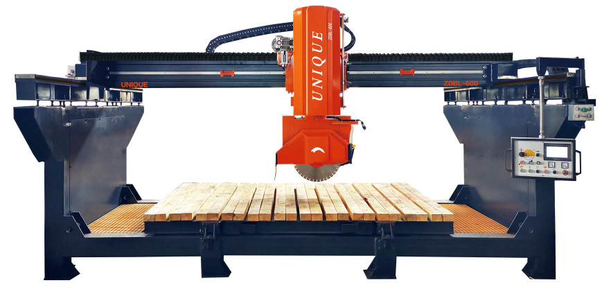 คานด้านข้างมีรางเลื่อนเชิงเส้นความแม่นยำสูงพร้อมการเคลื่อนที่ที่ควบคุมด้วยตัวเข้ารหัสในทุกทิศทาง พร้อมด้วยการตรวจจับไม้บรรทัดรางแม่เหล็กความแม่นยำสูง จะปรับความเร็วในการตัดโดยอัตโนมัติตามคุณสมบัติของวัสดุหินเพื่อความแม่นยำที่เหนือกว่า มอเตอร์เครื่องจักรหินเฉพาะช่วยให้หัวตัดหมุนได้ 0°-90° เพื่อเพิ่มความเร็วในการประมวลผล ในขณะที่ความสามารถในการเอียงใบมีด 0°-45° ช่วยขยายช่วงการใช้งาน